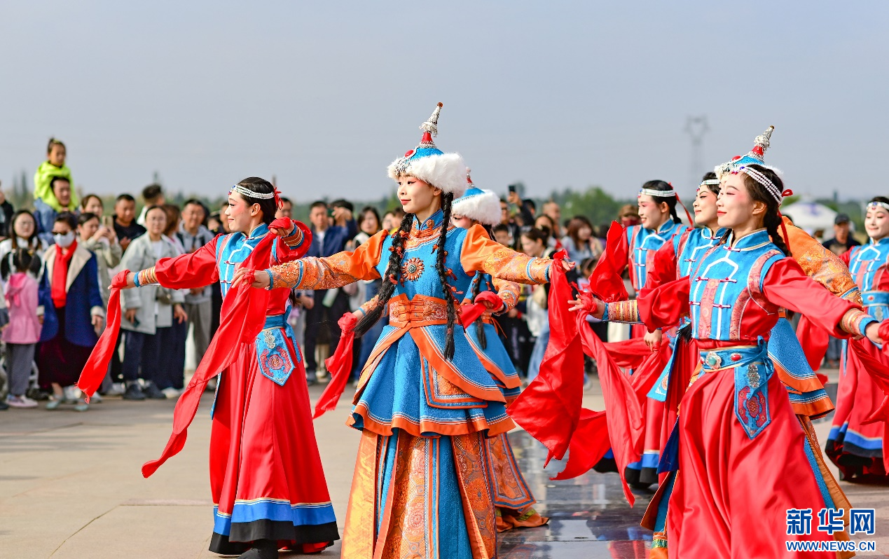 10月4日,演员在鄂尔多斯市伊金霍洛旗鄂尔多斯文化产业园表演快闪舞蹈。新华网发(王正摄)