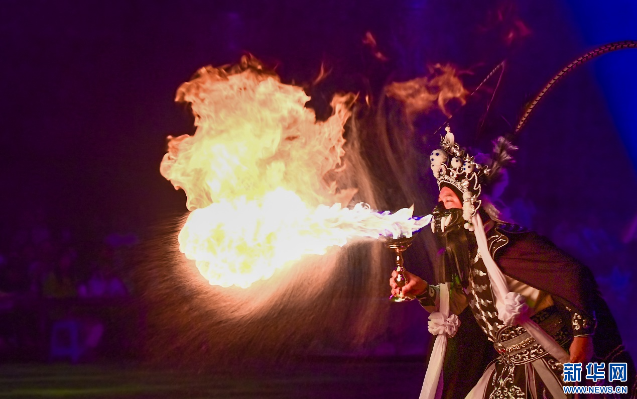 10月4日,演员在鄂尔多斯市伊金霍洛旗鄂尔多斯文化产业园沉浸式剧场表演川剧。川剧于2006年入选国家级非物质文化遗产名录。新华网发(王正摄)