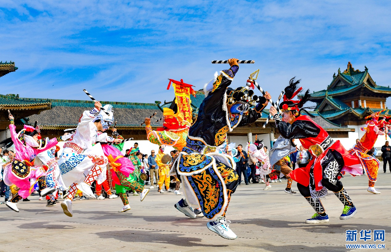 10月4日,民间艺人在鄂尔多斯市伊金霍洛旗鄂尔多斯文化产业园表演潮汕英歌舞。潮汕英歌舞于2006年入选国家级非物质文化遗产名录。新华网发(王正摄)