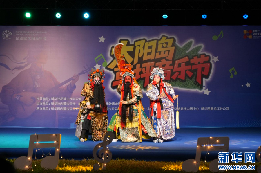 太阳岛草坪音乐节现场,太原市晋剧艺术研究院演员表演戏曲《千秋关圣》。新华网发(王伟 摄)