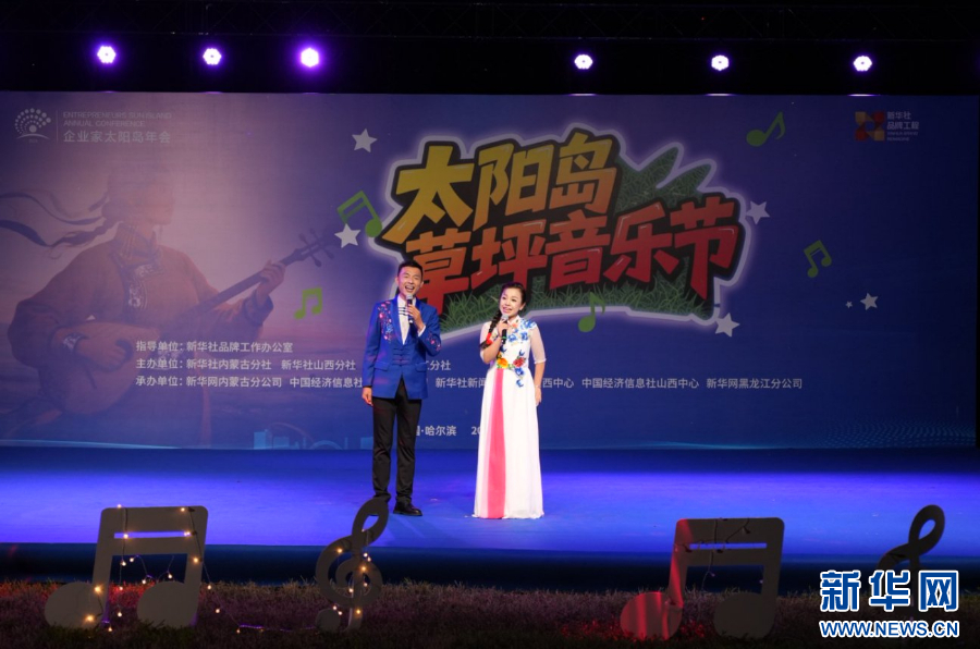 太阳岛草坪音乐节现场,歌手李波、张明叶演唱《会哥哥》。新华网发(王伟 摄)